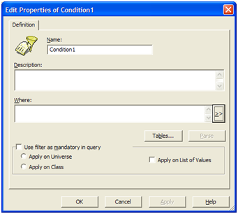 8. תוספת חדשה החל מגרסא Boxi 3.x , מאפשר לנו ליצור פילטר אשר יופעל תמיד כאשר ילקח אובייקט מאותו Class או בכלל בעולם. כדי לבצע את זה, יש להקיש במסך המרכזי של הפילטר על "Use filter as mandatory in query". לאחר מכן, יש לבחור על apply on universe או apply on class בהתאם לבקשתכם. במקרה כזה, הכיתוב של הפילטר יהפך למוטה לצד, כלומר נסתר מהמשתמש.