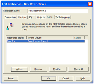 - לשונית Rows נחשבת ללשונית השימושית ביותר בהקשר זה. לשונית זאת מאפשרת לנו להוסיף משפט לחלק הWhere בתחביר הSql שנוצר. לדוגמא, אם בCMC מוגדרת קבוצה לכל סניף, נוכל לגרום לכך שכאשר משתמשים השייכים לקבוצה של סניף 1 יבצעו שאילתא על טבלת sales, יתווסף באופן אוטומטי לתחביר הSQL, המשפט הבא: