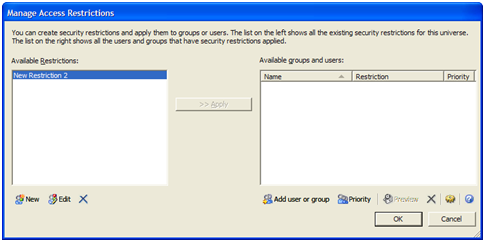 - תחת Restriction Name יש למלא את השם הלוגי של ההרשאה (במקרה זה מסומן New Restriction2).